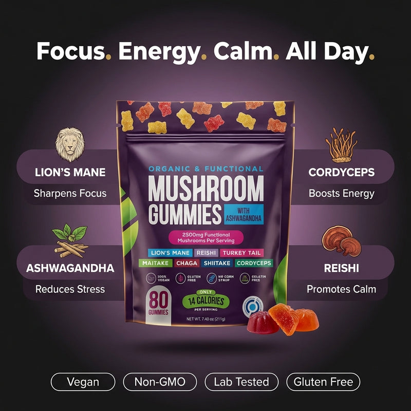 7 functional mushrooms and Ashwagandha in one delicious daily gummy. No pills, no powder, no compromise.
